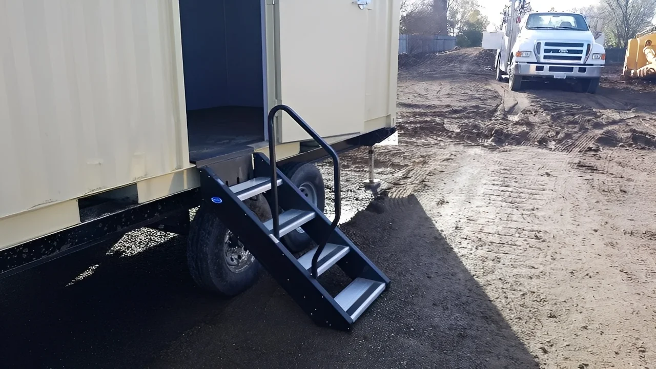 - Retractable Staircase with Handrail: Safe access is crucial on every job site. Our container includes a retractable staircase with a handrail to ensure secure and easy entry and exit, reducing the risk of accidents and providing peace of mind. 20ft Mobile Office Container With Trailer