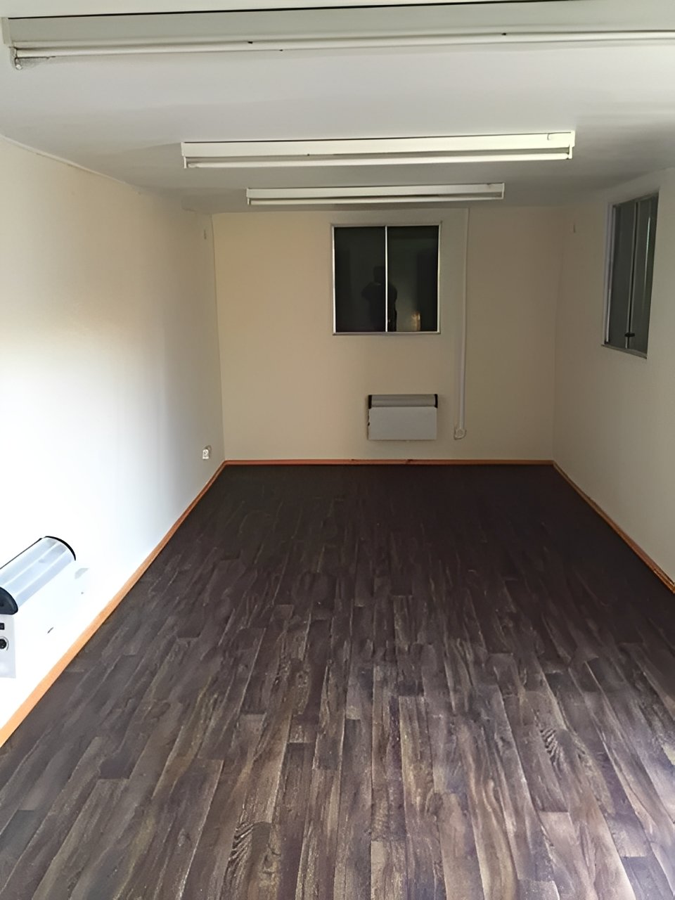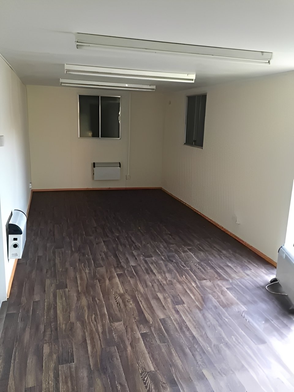 Office Area: Open-plan design with lighting, electric heating, power outlets, and three windows