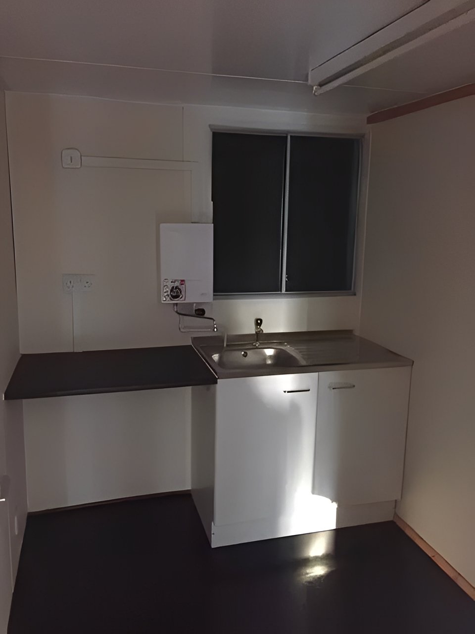 Kitchenette: Includes a base unit with sink, electric water heater, and countertop workspace