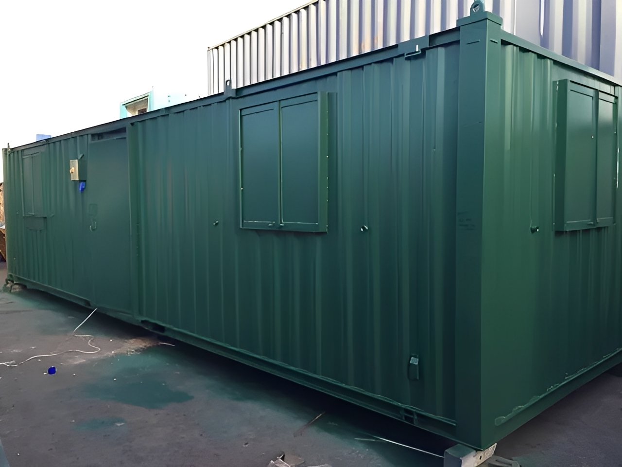 This 32ft x 10ft Anti-Vandal Container Cabin is a robust, all-in-one portable solution ideal for construction sites, industrial zones, or remote job locations. Built with durable anti-vandal steel construction, the cabin features three functional sections: a restroom with a toilet and hand wash sink, a kitchen with a sink, water heater, and worktop, and an open-plan office space complete with electric lighting, heating, power outlets, and three secure windows.